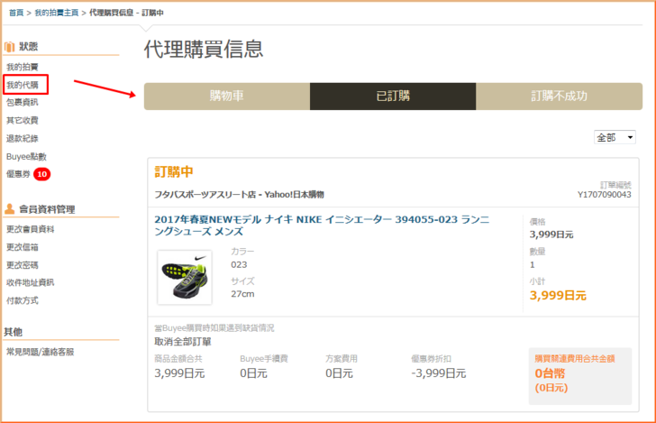 【▼】回到代理購買的信息中,可以發現商品已從 "購物車" 轉移至 "已訂購" 的狀態,並提供了該商品的訂單編號,未來有問題都可以用該編號進行查詢。