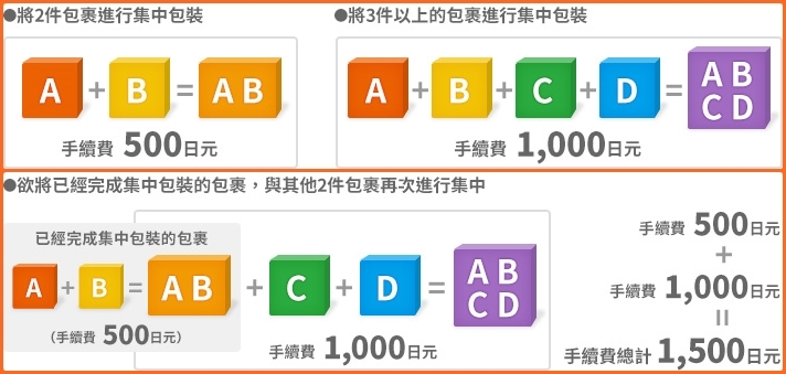 ★「集中包裝」的特色就是當您買了不只一樣的商品時,Buyee能進行集中後寄出,您就能一次收到所有的商品。兩件以下手續費只要500日元,將3件以上的包裹進行集中包裝則需1,000日元,若商品不同時間寄到,若已經完成集中包裝的包裹,再次與其他包裹申請集中包裝時,是會再度向您收取手續費的。已經完成集中包裝的包裹視為一件,若與其他兩件包裹再度申請集中包裝,此時,包裹件數總計為三件,集中包裝的手續費即為1,500日元。