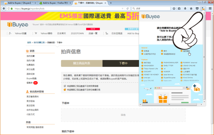 【▼】OK,重開Firefox之後,會在右上角產生 "Add to Buyee" 的功能鍵圖標,而下面眾多的品牌連結都是可與 "Add to Buyee" 作交易的店家,高達百家的後援,真的想買什麼就有什麼!