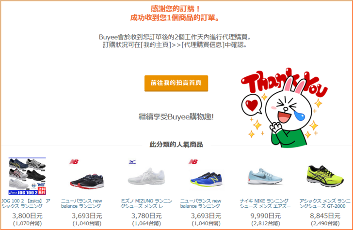 【▼】當看到這個畫面時,就代表您已經成功下訂商品了,您可以回到商品頁繼續購物或是回到我的拍賣首頁查看代買的相關信息。
