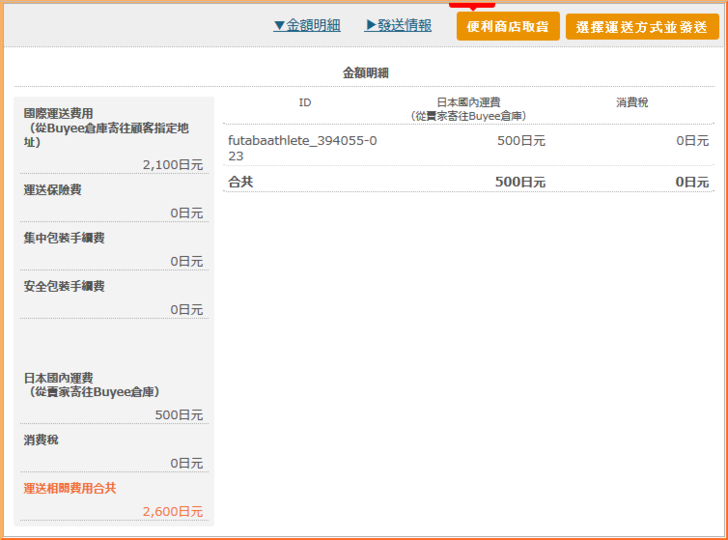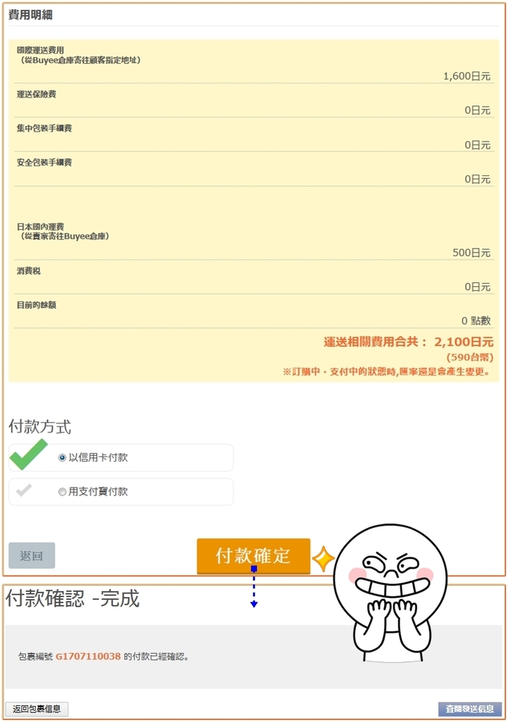 【▼】費用明細中可以看見小編運送費用為海運1600日元+賣家寄往Buyee倉庫的500日元,總共2100日元(約590元台幣),直接以信用卡完成付款。