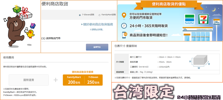 【▼】針對台灣的民眾,Buyee也釋出台灣限定的服務,只要包裹尺寸與重量(7kg)在限制以內,就可以到7-11、全家兩大便利商店取貨,小7手續費為250日元,全家則收200日元,Buyee就是要給您24小時、365天不中斷的優質服務。