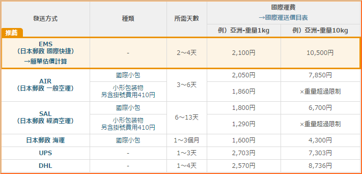 【▼】Buyee提供了有多種的運送方式,包含EMS、AIR、SAL、海運、UPS、DHL,價格上以UPS最貴,小編建議常用的EMS就很快了,除非真的不急,不然選海運也是個不錯的抉擇。