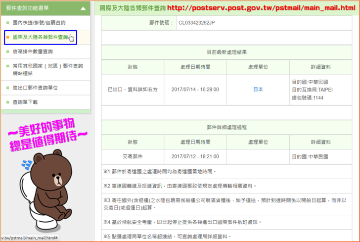 【▼】網路郵局中,點選 "國際及大陸各類郵件查詢",輸入國外配送編號即可查看目前商品的運送狀況。這時就慢慢等,急不來的~