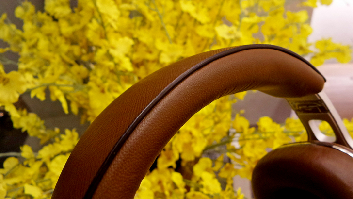 【▼】在P9 Signature耳機頭帶部分,外緣一樣使用義大利Scabrenta Saffiano咖啡色皮革,並運用獨特壓紋技術,讓皮革展現交叉有型的格菱紋路。皮革全長披覆約25cm,中間最厚處有5cm,以小編整個頭圍將近60cm來試戴,頭頂部接觸面才20cm不到,左右耳罩的裕度都很足夠,是一款大人小孩、男孩女孩都很適合的頭戴式耳機。