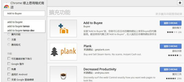 以往在日本買代購只能透過朋友帶點東西回來,但其實只要在Chrome線上應用程式商店的擴充功能裡,找到Add to Buyee並安裝它,就可以在它合作的所有日本網站買東西享優惠。