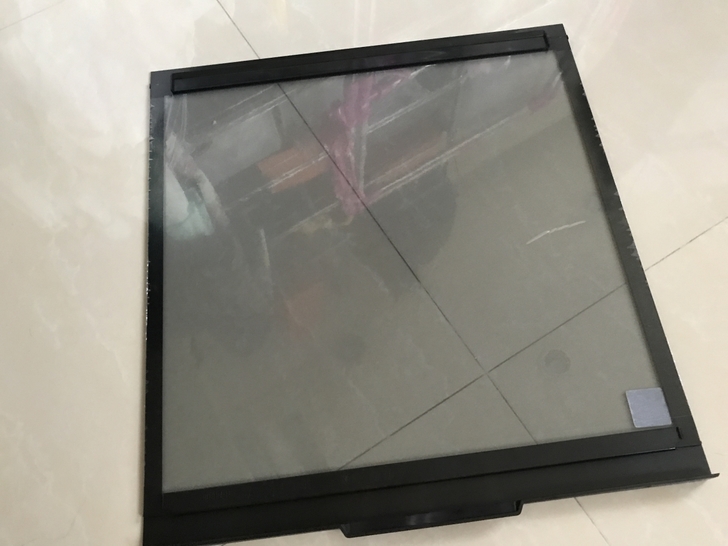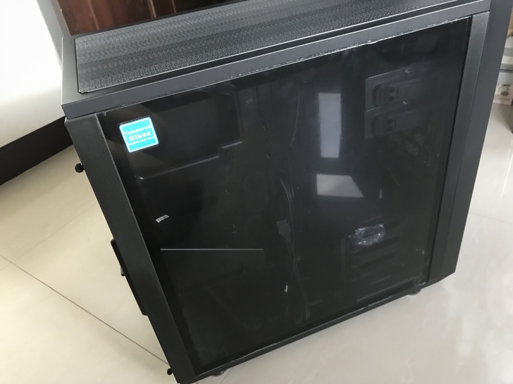 來看看重點部位,就是主要側面的玻璃面板,它是一大片的強化玻璃加上左右兩邊塑膠組件而成,若組裝好,加上現在板卡的發光效果,應該不錯,不過現在看不太出來且玻璃上的保護膠膜小弟沒撕下來