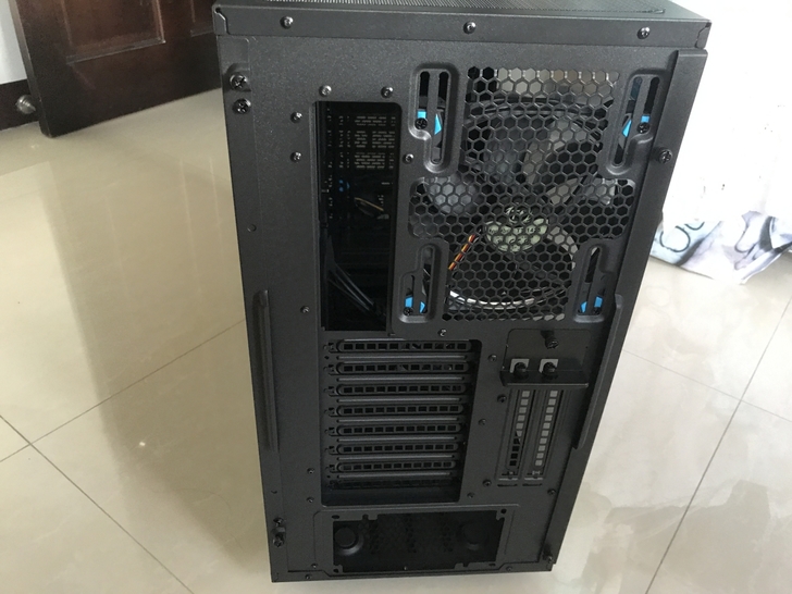 後方長這樣,可看到內部已安裝好一顆風扇且風扇的鎖孔位置有很大的彈性,應該可以符合多種風扇的安裝