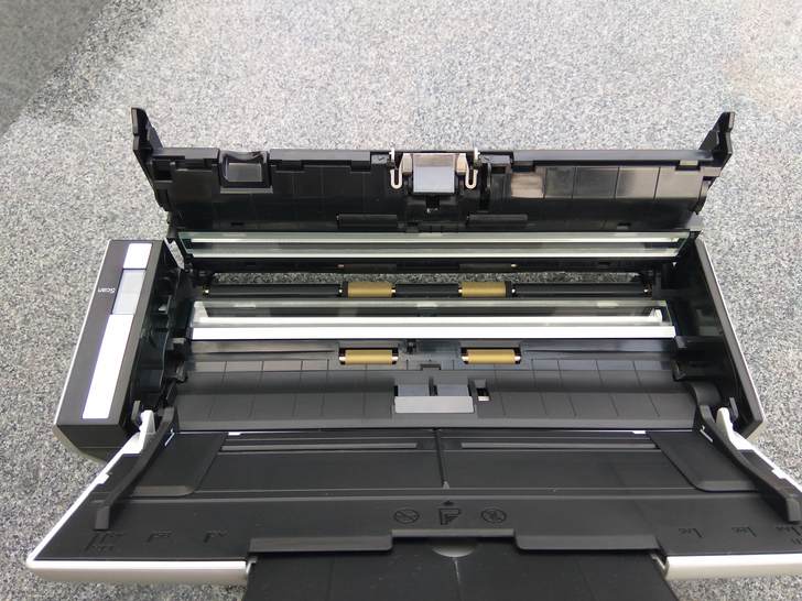 ▲一個盒子怎麼掃描,這就是FUJITSU ScanSnap S1300i設計的巧思了,上方可翻開延伸,變成進件的支撐。