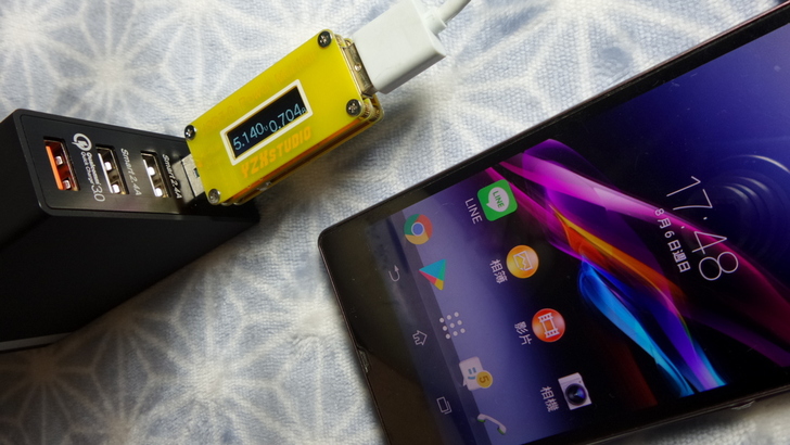 【▼】實際測試,以Sony xperia Z1連接於五孔桌面充的Smart 2.4A的接孔上進行充電,電壓電流約5.14@0.7A,尚未到達2.4A的上限。