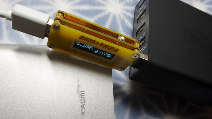 【▼】實際測試,以小米行動電源連接於五孔桌面充的QC3.0的接孔上進行充電,電壓電流約5.34@2.08A,也尚未到達2.4A的上限。充電速度從小米0格到滿格約六個小時,平常用USB充要將近10個小時才滿,快將近有一倍,真是太神奇了!