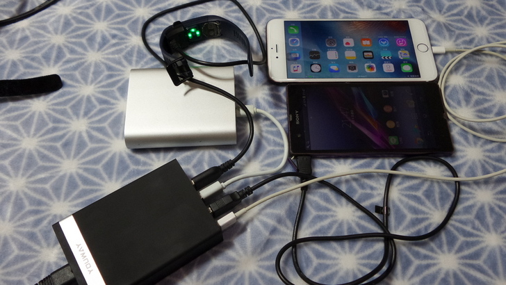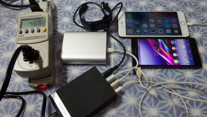 【▼】實際測試,連接小米行動電源、Garmin運動手環、iPhone6S+、Sony xperia Z1,變壓器提供的額定功率46.5VA。