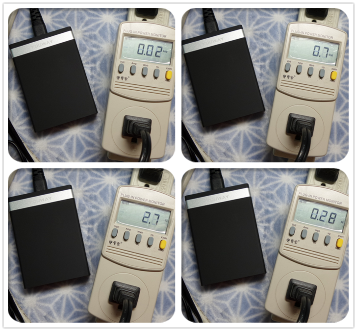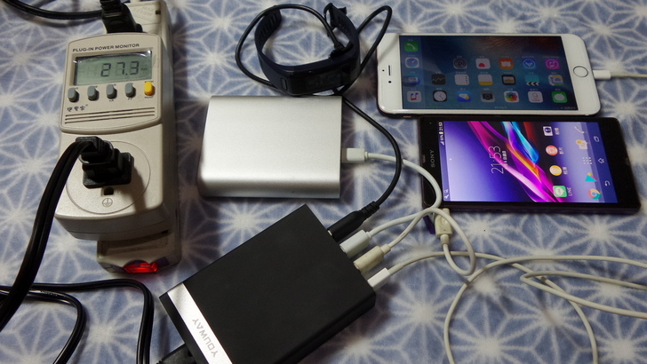 【▼】實際測試,連接小米行動電源、Garmin運動手環、iPhone6S+、Sony xperia Z1,空載總消耗功率為27.3W。
