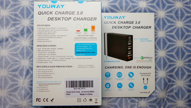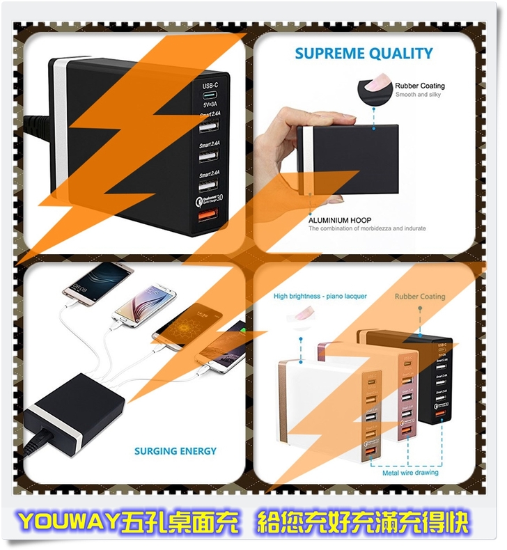 現代人隨隨便便身邊都有個三、五個行動裝置,從最常見的手機、平板到俗稱尿袋的行動電源與掌上型遊樂器等,真的常常都得為它們吃電,有幾個裝置就有幾個豆腐頭,豆腐頭也就是AC to DC的變壓器,通常額定電壓為5V,接頭以microUSB為大宗,不過最近快充技術逐漸成熟,慢慢有9V或是高電流的豆腐頭出現,接頭方面能正反插的USB Type-C也趕上了microUSB。不過這些豆腐頭還是得插上插座後連接充電線才能開始充,對於一條延長線有五個孔來說,龐大的豆腐頭體積會擋住旁邊插座,跳著插一次只能同時充三個裝置,對於趕時間的現代人來說,真的好不方便。今日要與大家開箱的是一款五孔的桌面充,不但支援高通快速充電3.0更有旗艦機種才有的Type-C直輸出,馬上來測試看這款YOUWAY的表現吧!