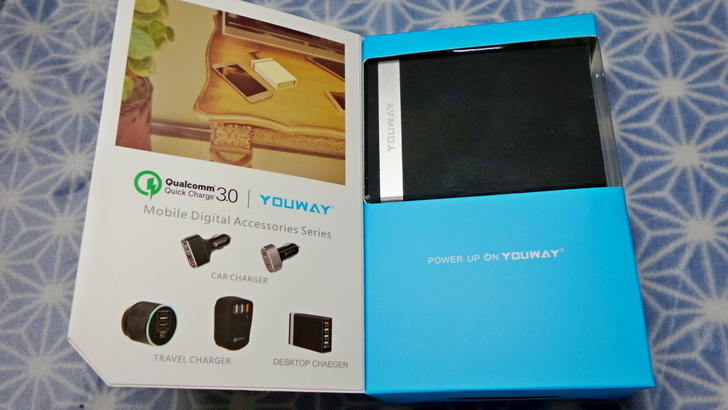 【▼】掀開隔層後,可以看見銀黑色的桌面充,左邊是YOUWAY相關產品線的介紹,有車充、旅充,業界評價都蠻高的。