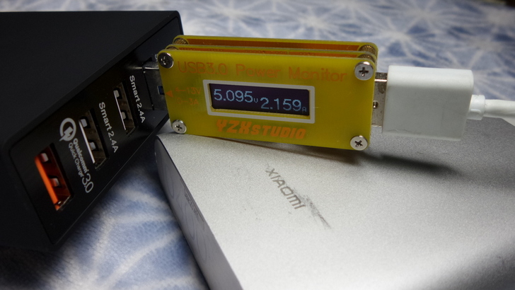 【▼】實際測試,以小米行動電源連接於五孔桌面充的Smart 2.4A的接孔上進行充電,電壓電流約5.09@2.16A,尚未到達2.4A的上限。