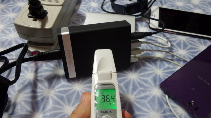 【▼】而充了30分鐘後,溫度表現如何呢?比起塑膠發燙的豆腐頭來說,內建三大金屬散熱片的五孔桌面充本體才36.4度C。在炎炎夏日裡,根本就是神機~