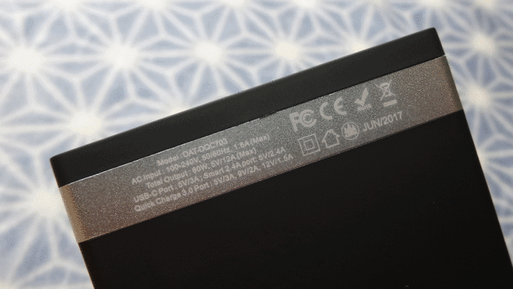 【▼】銀黑色的五孔桌面充,其表面是橡膠塗層,銀色的金屬箍環正面印有YOUWAY英文LOGO,背面則可以看見型號為DAT-DQC703與相關安規認證,額定輸入為100-240V、50/60Hz@1.6A,額定總輸出為5V@12V,共80W。