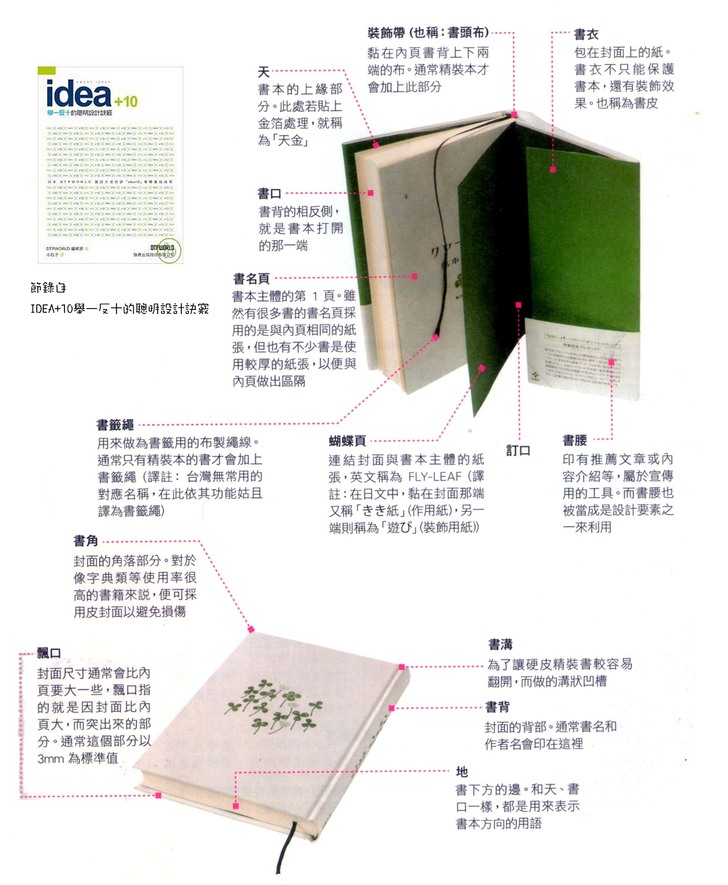 ▼拆書之前應該了解一本書的構造與裝訂方式,因為本文的主題是非破壞性掃描,因此簡單帶過就好,下圖節錄自  IDEA+10舉一反十的聰明設計訣竅