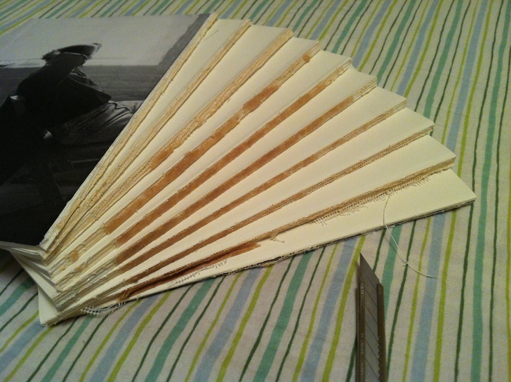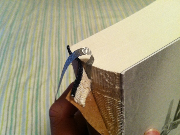 ▼撕開書背紙之後發現有一條書籤帶跟紗布,這就是傳統精裝書的做法