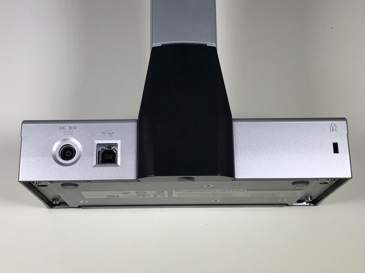 ▼底座的背面很簡單,由左至右分別是 AC電源插孔,USB 2.0 Type-B ,跟最右側的 Kensington lock 防盜鎖孔