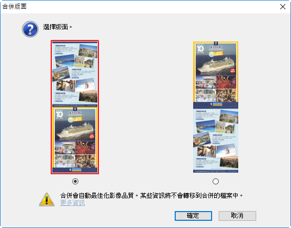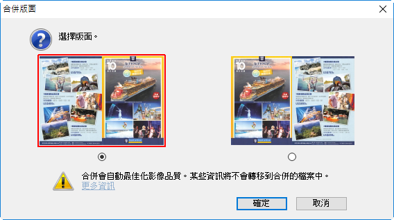 合併頁面功能,可以將原本的A3頁面折成正反面掃描後合併,也可以將A4雙面合併成一個頁面