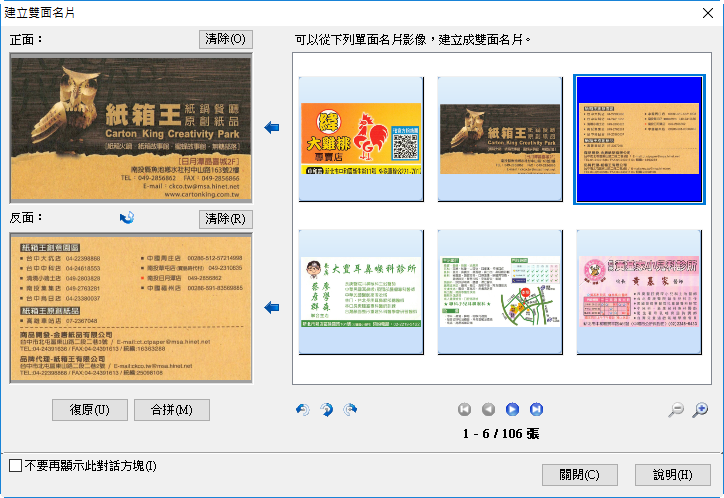 掃描完成後,可以透過軟體將雙面的名片合併在一起,並自動辨識各項資料,方便爾後使用