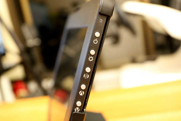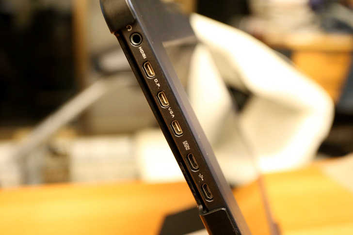 螢幕的左邊則是端子由上而下分別為:3.5mm耳機孔 / HDMI / DP / VGA / DC 5V / Micro USB ,主流的輸入端子均配備在1303A上。