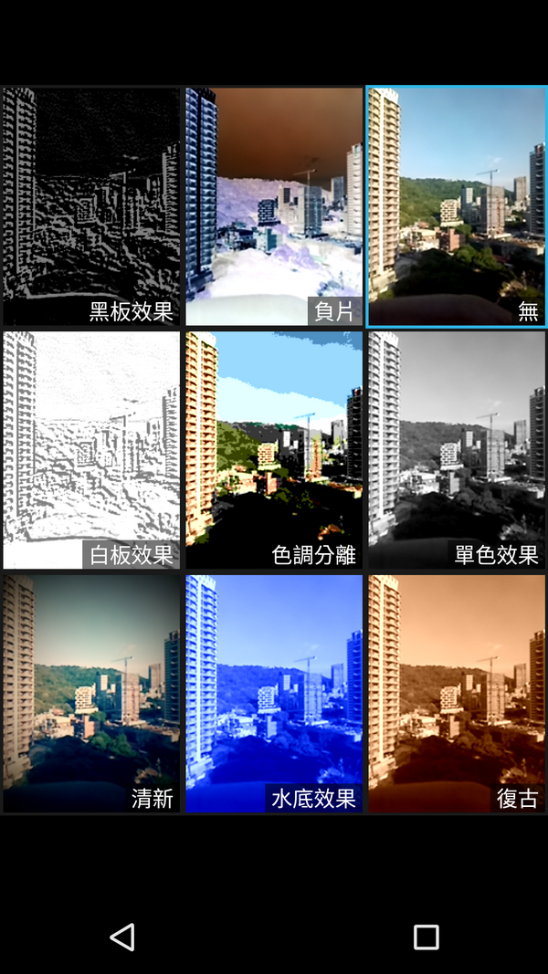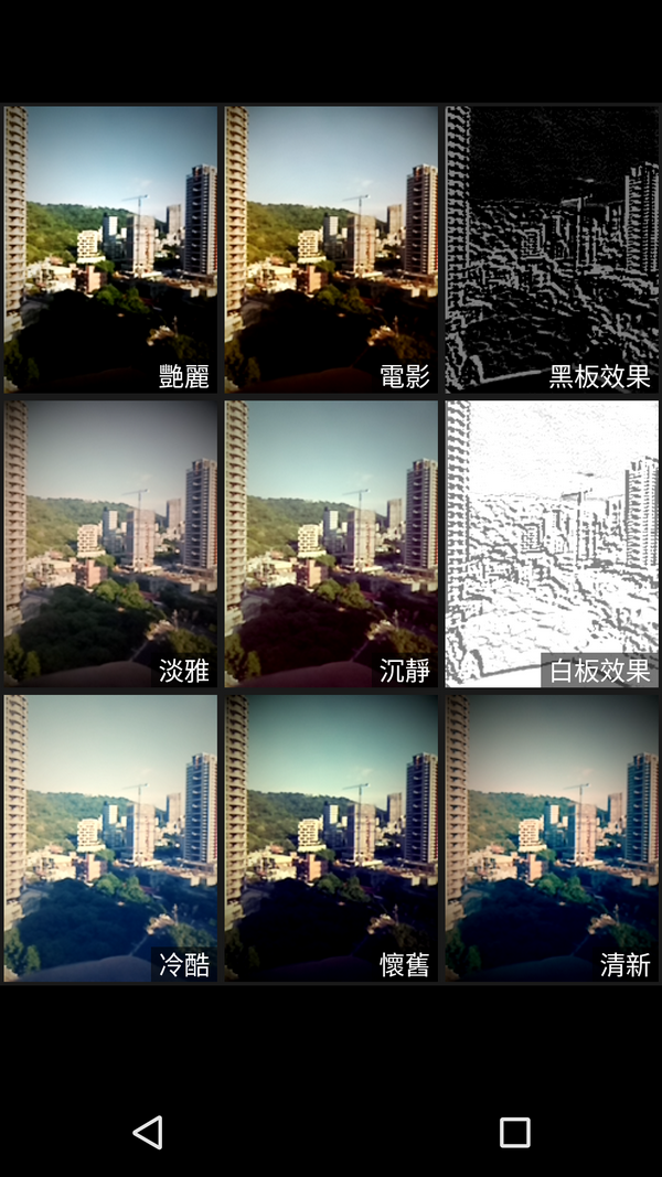 主畫面下方的箭頭按下去之後,可以得到15種濾鏡效果。個人覺得濾鏡效果用得好,文青一個,濾鏡效果用得太多太雜,東施效顰而已。