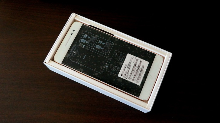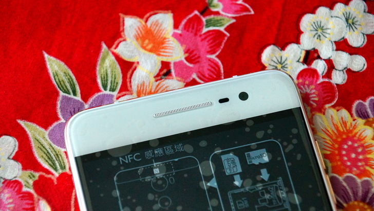 手機背面是金色的機身,不會看起來很刺眼,也不會看起來很俗氣,手機的正面為白色,上方從中到右是聽筒,光線/距離感測器,前置相機鏡頭(1300萬畫素,F2.4光圈)