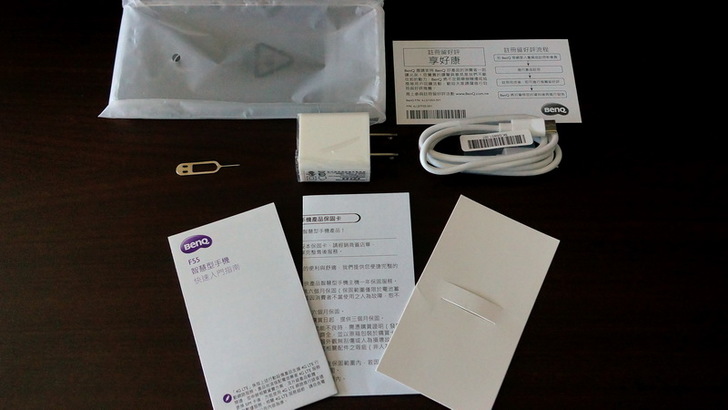 說明書,保固卡,註冊卡,一個不知名的卡片,充電器,充電線,退卡針還有最重要的透明手機殼,BenQ這點也算是貼心,怕大家手機買不到BenQ F55的手機殼,乾脆附一個給你。
