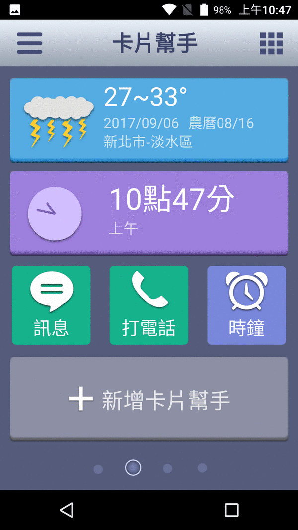其實簡易主桌面,就是所謂老人模式,把一推各式各樣的按鈕,都變成制式化方格,每一格就是一個功能,方格大不容易誤按,字體大不會看不清,配色也不會眼花撩亂,對於對手機不熟的老人家,這可是很方便的。
