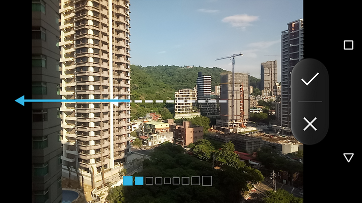 在移動的過程中,不用怕手抖,因中間的過程不會拍照,只要藍白箭頭貼合的那一瞬間不要抖動就好,但不要移動位置,原地扭腰即可,焦距跑掉就不好了。拍完第二張之後繼續扭腰拍第三張……依此類推下去,最多可以拍九張照片合成一張。但我通常只拍五六張,因為老人家骨頭硬,扭腰範圍沒那麼大……