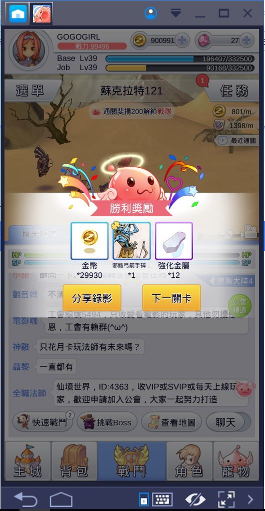 在面前我也稍微介紹了一下關卡是需要利用挑戰BOSS闖關後才會解鎖的!而每次闖關的結果,也會獲得BOSS身上的獎勵,最需要就是金幣、強化金屬這兩項啦~至於寵物碎片我到是覺得要蒐集一組起來,還真不知道要花上多久的時間才有機會湊到呢!
