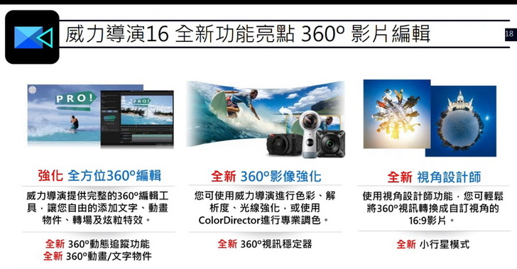 訊連科技 創意導演家族6發表會,宣布推出全新的威力導演16、相片大師9,大大提升了剪接、編輯360影片還有照片的功能,增加了 360影片穩定器、小星球特效等功能,使用者的360素材能更加快速及便利的編輯。