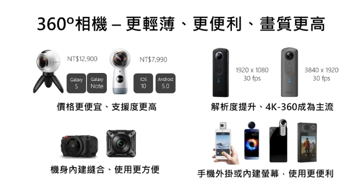 ▼ 隨著 360°相機 普及,現在市面上慢慢的 更便宜、更輕薄、更便利、畫質更高。