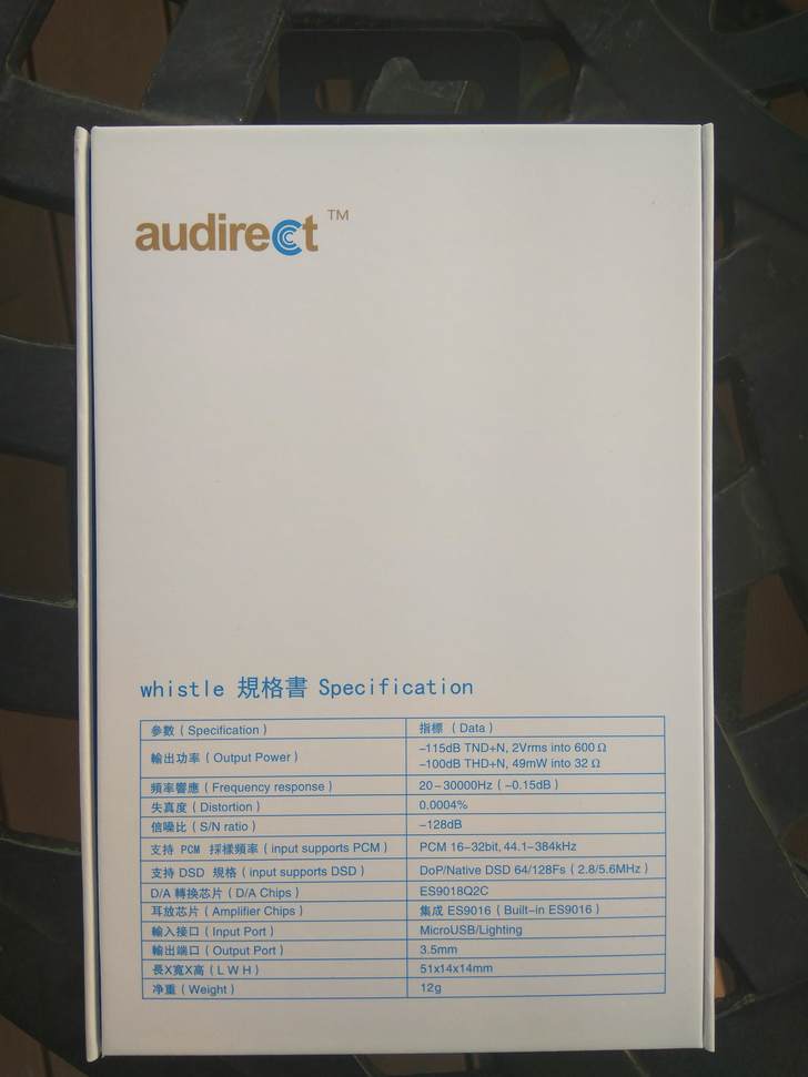 ▲背面則是Audirect Whistle規格說明,DAC晶片採用 ESS9018Q2C,耳機擴大機則使用內建ES9016,熟悉音樂的玩家,對 ESS9018Q2C這個DAC應該很熟悉,市場對它的評價普遍也算不錯。