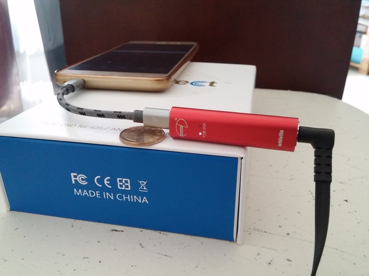 ▲ANDROID設備由期多採用Micro USB介面,而近期則有向TYPE C靠攏,但沒關係,Audirect Whistle都有提供連接線。目前個人手機仍使用Micro USB介面,由於跟Audirect Whistle輸入介面相同,所以線材有方向性,上方有一個▲符號,尖頭方向為輸出的方向,也如圖所示,尖頭朝Audirect Whistle就可以了。前面開箱可能還沒感覺到Audirect Whistle小巧,拿它跟一圓硬幣比較,應該可以知道它真的滿小巧的。