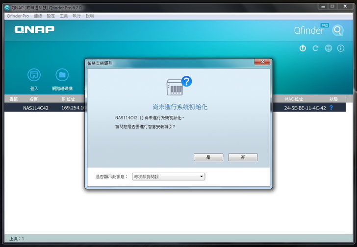 ▲ 因為 NAS 還沒有初始化,所以詢問是否要做初始化動作,同時還有智慧安裝指引,這裡當然點選【是】按鈕