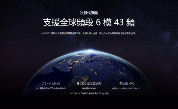 支援全球頻段 6 模 43 頻 小米MIX 2 是目前支援通訊頻段最多的手機,台灣全頻全支援,可放心地在台灣各地與全球範圍內使用。