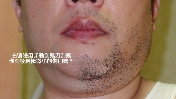 首先我先用手動刮鬍刀照一般流程刮我右邊臉的鬍子,這其實事件稀鬆平常的事,但有拍照的壓力之下,刮到嘴角附近的時候,我心裡隱約就覺得不妙。
