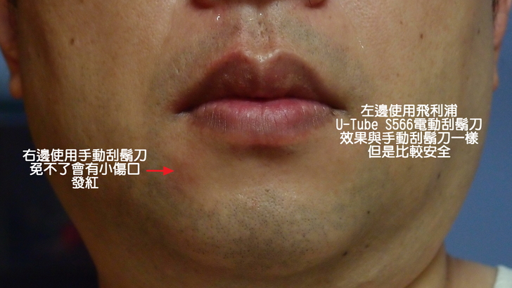 飛利浦U-tube S566刮鬍刀把我左邊的臉頰也刮得乾淨,也沒有發紅不適的現象。