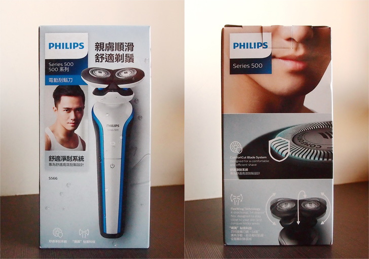盒子不大,但是正面的帥哥超帥的,哎呀,這不是重點啦,重點是飛利浦主打的「舒適淨刮系統」與「順翼貼面科技」啦。稍後我會詳細介紹。