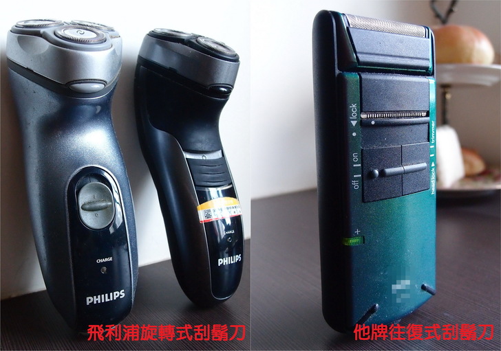 我爸是往復式刮鬍刀的支持者,我是飛利浦旋轉式刮鬍刀的支持者,旋轉式刮鬍刀的特點是可以刮除較為深層的鬍鬚,因為旋轉式刮鬍刀的刀片是先拉起鬍鬚再刮除,所以深層的鬍鬚會被刮除。但是由於旋轉的速度快,所以使用者不會有被拉扯的感覺。