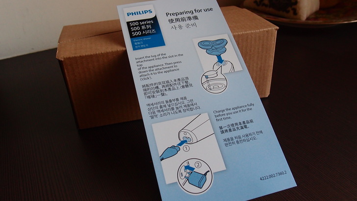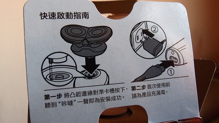彩盒打開時,廠商提醒你安裝刀頭時要特別留意,同時也請你記得充電。