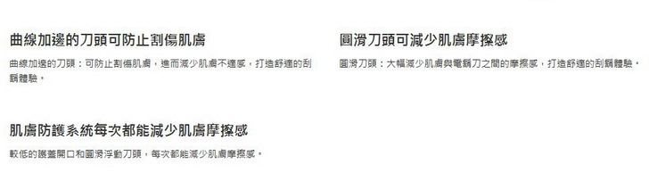 那有什麼好處呢?曲線加邊與圓滑刀頭可防止肌膚刮傷,降低刀頭與皮膚的摩擦,減少皮膚不適的問題。有的人天生就是所謂的厚臉皮,這個可能跟你沒有太大關係,但是對於有些天生臉皮薄,或者敏感性肌膚的人,或者冬天皮膚比較乾燥的朋友,這個差別真的很大。