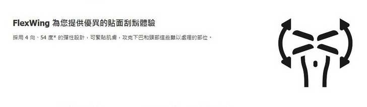「順翼貼面科技」這也是為了讓刮鬍刀頭能緊密貼合皮膚所設計出來的,藉由刀頭四個方向的活動來緊密貼合皮膚,如果以刮鬍刀正面對著使用者,縱向浮動18度,橫向浮動36度,合計可活動角度為54度。