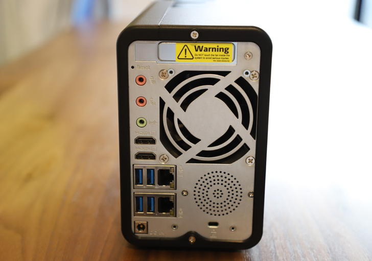 產品後方的I/O端子很齊全,包含4組USB 3.0、兩組4K HDMI、2個3.5mm麥克風輸入、1個3.5mm Line out輸出,一個揚聲器與一個可以擴充無線基地台或是容量功能的PCIe擴充槽