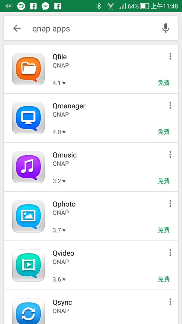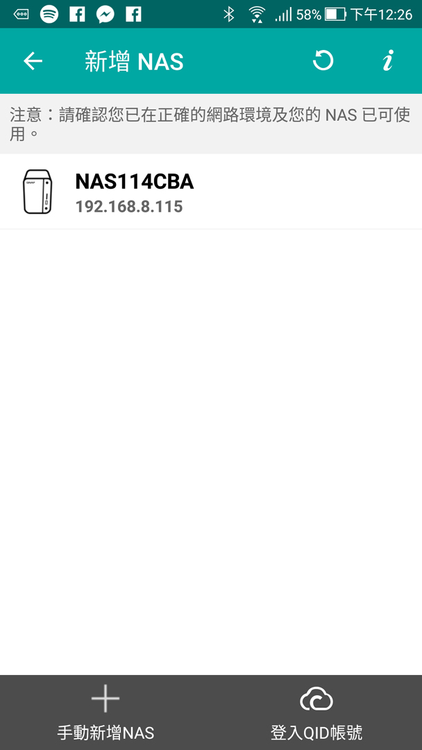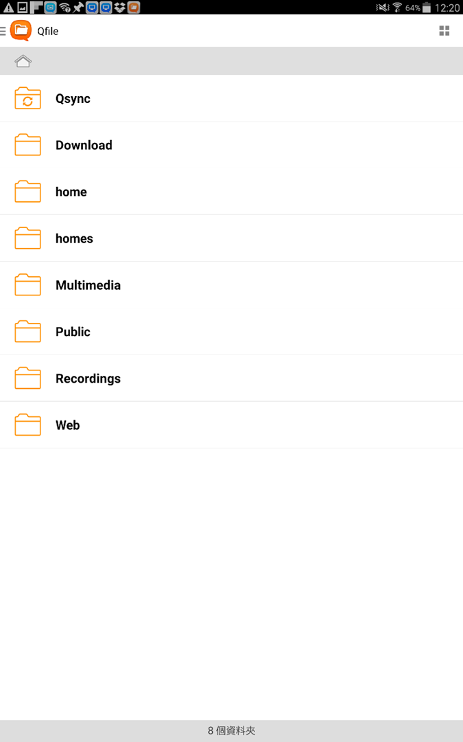 由於這個APP功能很實用,於是我特別在這邊多著墨一番~ 簡單來說,透過手機上的Qfile APP,就可以輕鬆讓手機與NAS之前資料傳遞;在成功登入Qfile之後,如下圖,螢幕上會顯示可存取的資料夾。