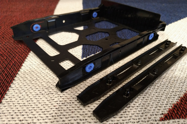 產品的安裝方式非常簡單與智慧,面對NAS左側有的開關,解鎖後就能輕鬆將面板卸下,這時就能將2個HDD固定座卸下,取出HDD固定座後,記得將左右兩側的固定條卸下,將3.5”HDD放妥後再固定回去,這時可以發現HDD已經很牢固的固定再HDD固定座上拉!